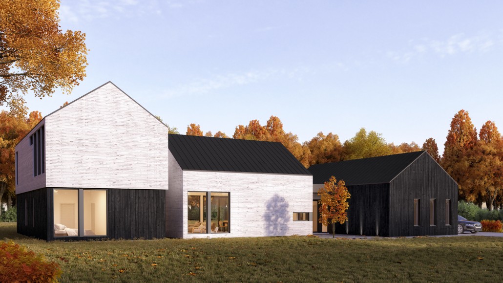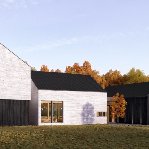 A large, single-family dwelling that features clean lines and, simple, fresh materials for a contemporary look that fits perfectly in a countryside location. An outdoor rear patio and a long-span view from the entryway to the back garden create a soothing connection between house and nature. Visual continuity throughout and several skylights produce an airy, bright principal residence or cottage that stays cozy in winter as everyone gathers around the fireplace.