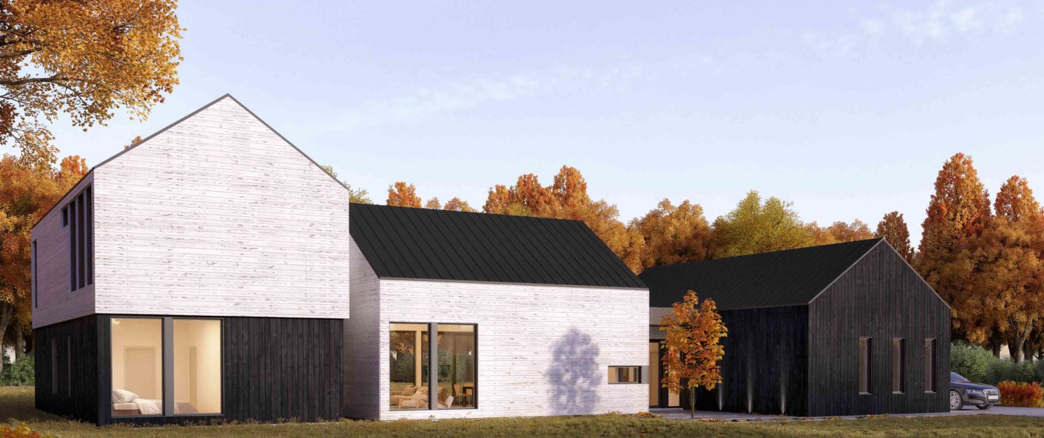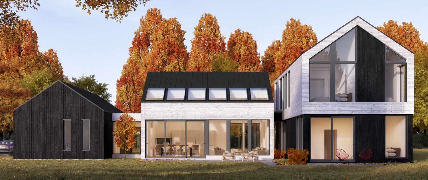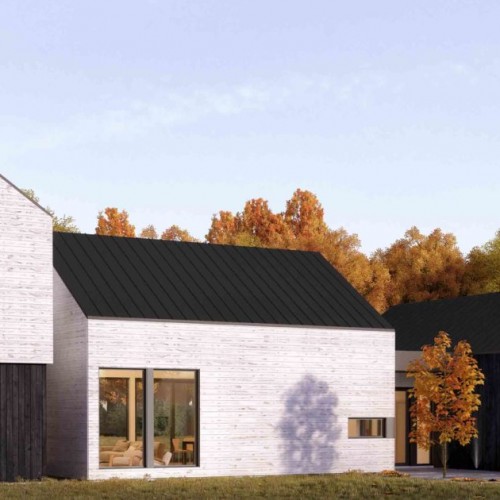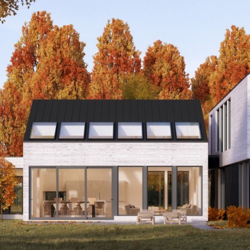 A large, single-family dwelling that features clean lines and, simple, fresh materials for a contemporary look that fits perfectly in a countryside location. An outdoor rear patio and a long-span view from the entryway to the back garden create a soothing connection between house and nature. Visual continuity throughout and several skylights produce an airy, bright principal residence or cottage that stays cozy in winter as everyone gathers around the fireplace.