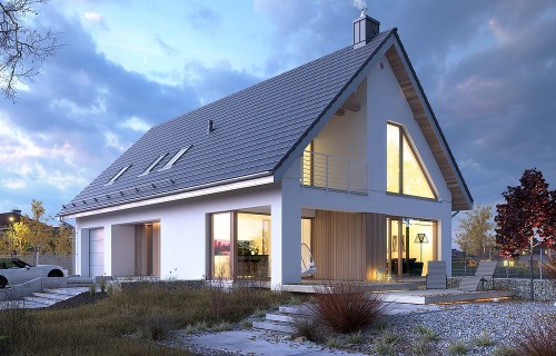 The house design of Available 6 is a perfect combination of a modern look with a fully functional interior. The house has a simple shape, which directly affects the smooth workflow. It is intended for investors who have a plot of land that allows for the implementation of a free-standing project. The building is topped with a gable roof, so its implementation does not take much time. The project belongs to the category of houses with a ridge located parallel to the road, which is often defined in development conditions. The project provides for a single garage in the body of the building, with a passage from the residential part through a practical wardrobe. Available 6 is a one-story house with an attic, which means that the day and night zones are clearly separated from each other. The living area provided for in the design will surely satisfy those who prefer spacious interiors. This zone of the house includes large glazing and an open space above the living room, thanks to which the interior looks modern and very effective. Additionally, the living room has been combined with the dining room - such a solution fits perfectly into the current arrangement trends. The kitchen is open yet slightly separated from the rest of the rooms. Thus, cooking enthusiasts can easily pursue their hobbies, and at the same time freely talk to other household members. People working at home will appreciate the fact that there is a study and a bathroom on the ground floor. An additional room is also a perfect solution if you need to spend the night. There are three spacious bedrooms in the attic. From one of them there is an entrance to an impressive loggia. On this floor there is also a bathroom, a laundry and drying room and a mezzanine - an ideal place to rest with a book. Family gatherings on sunny days will be made more pleasant by the terrace next to the house. The project was made in brick technology, thanks to which the house remains pleasantly cool in hot weather. The Available 6 project is characterized by a minimalist body with large glazing, making it an ideal choice for supporters of a modern style.