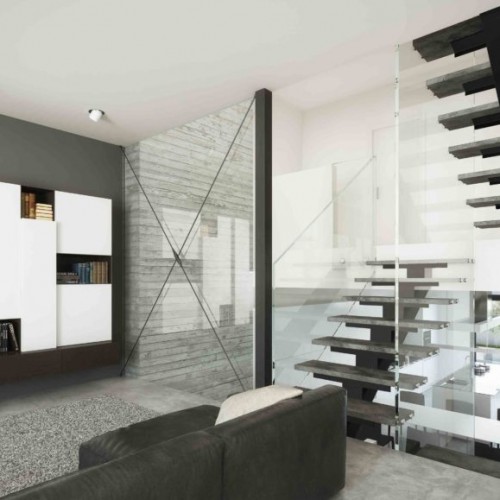 This inspiration is a split-level concept featuring a triple-height space with skylights above the central staircase. The master bedroom has higher ceilings, while the kitchen and dining area are in a semi-basement with a patio door that leads to the exterior sunken backyard.