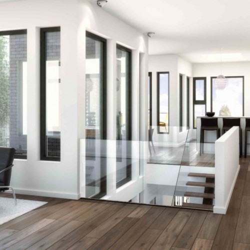 This inspiration has an interior courtyard that separates the kitchen and dining room at the back from the living room at the front of the building. There is a social space with higher ceilings on the upper floor and a single-car garage with a mudroom.