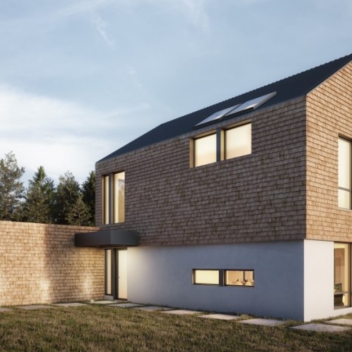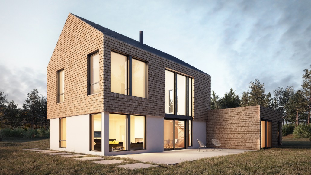 This inspiration combines the tactile pleasure of traditional rural surfaces with the style of modern contemporary living. It features two volumes, one a main living space on two floors with a fireplace as a focal point, the other a broad horizontal volume containing the garage, some service areas, an office and master bedroom. Oversized windows allow light to flood the interior spaces and provide outstanding views of the surrounding nature.