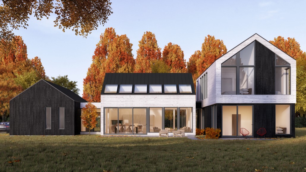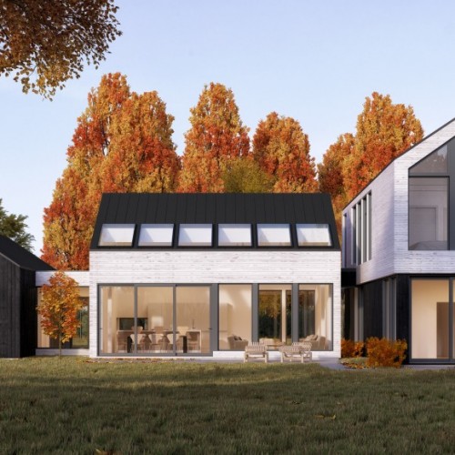 A large, single-family dwelling that features clean lines and, simple, fresh materials for a contemporary look that fits perfectly in a countryside location. An outdoor rear patio and a long-span view from the entryway to the back garden create a soothing connection between house and nature. Visual continuity throughout and several skylights produce an airy, bright principal residence or cottage that stays cozy in winter as everyone gathers around the fireplace.