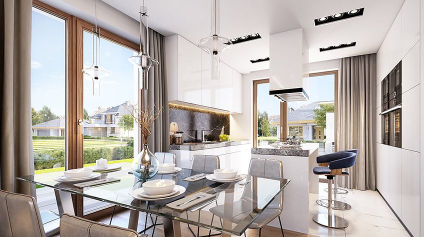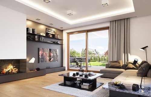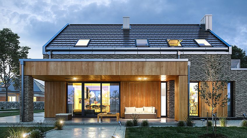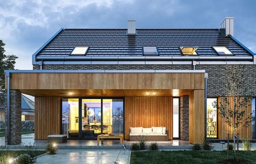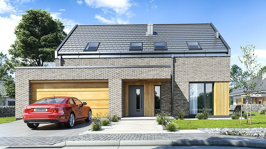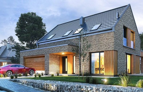 The Rumba house plan is a new version of the project belonging to the group from the series of houses derived from the "Party" project, which together form a collection of "dancing" houses, that is: Party, Party 2, Biba, Fokstrot, Salsa, Samba, Tango. The design of the Rumba house was designed on a functional plan similar to the aforementioned houses, but its style is completely different, original. The entire body of the building is finished with one material - all walls are covered with clinker tiles. Window openings widened with additional cladding made of wood create cutouts in this uniform brick block. A gable roof made of flat tiles, without eaves, completes the composition. The design of the Rumba house is modern, original and will surely stand out from dozens of similar houses - roofers. At the same time, the finishing materials used bring to mind: elegance, decent workmanship, durability and longevity of the building. This effect was achieved despite the relatively low cost of building the house. The Rumba house plan has a very simple shape and structure - it will be easy and relatively cheap to build. The interior of the house: on the ground floor there is an open living space of the combined living room, hall and kitchen. A kitchen with an island, a wall fully built-in household appliances, with a front window reaching the floor will decorate the living space. The living room with a wide fireplace and TV wall opens onto the surrounding garden and partially covered terrace with large glazing. The other rooms on the ground floor are a room (office or an additional bedroom), a bathroom with a shower and a storage compartment under the landing of the stairs, a pantry between the kitchen and the vestibule, and a double garage and a boiler room. In the attic, we have three bedrooms, including: parents' apartment with a bathroom, dressing room and own terrace, and two children's bedrooms with built-in wardrobes, separate bathroom and laundry room. In a small area of the house, it was possible to design a very comfortable interior for a family of 4-6 people. The Rumba house design is an excellent proposition for brave investors who want to stand out in a smart way. A consistently implemented project will be an attraction among the surrounding buildings and certainly no one will pass by such a gem indifferently. Welcome!