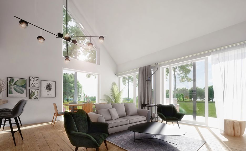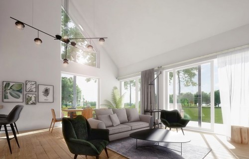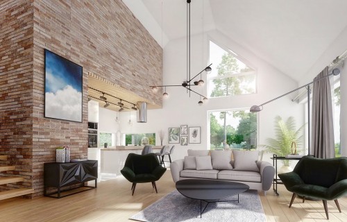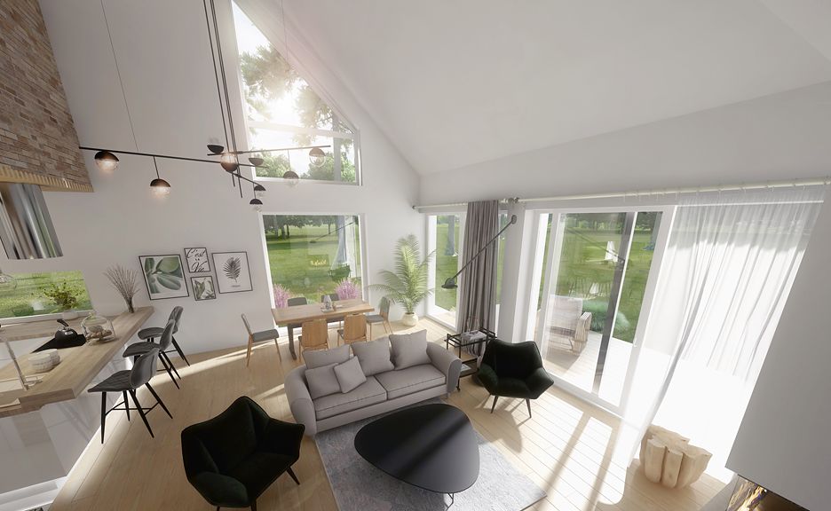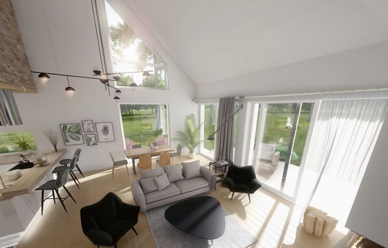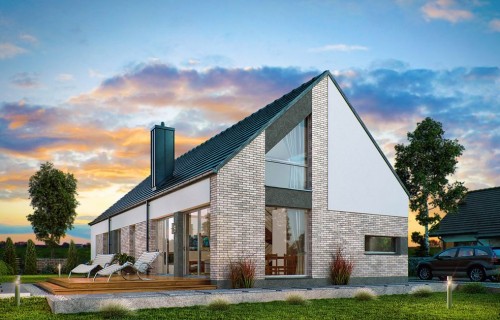 DOMENY 123 is a project for a family of 4-5 people, created for a narrow plot. The vestibule with space for a wardrobe opens onto the day zone, consisting of a spacious living room with a dining area and an easy to separate kitchen with a pantry. From the corridor, we have access to two rooms, a bathroom, a laundry room and a master bedroom with a wardrobe and another bathroom adjacent to it. The stairs lead to the mezzanine from which there is access to the attic. A large unused attic can be easily adapted for utility purposes, for example as additional rooms. The standard design has an additional fireplace heating design with a water jacket. Visualization is a proposal of how a given house design and its surroundings can be arranged. The method of running the terrace, the shape of the walls and elements of small architecture such as pergolas, pots, etc. are not included in the scope of the project. Therefore, in the construction design, these elements may not be included in the design (see pergolas) or their shape and method of running (size of terraces, wall profile) may be changed.