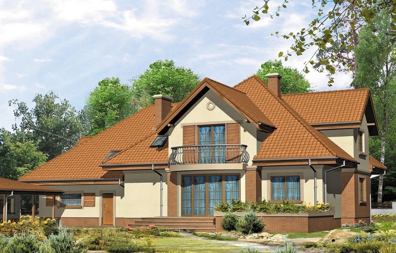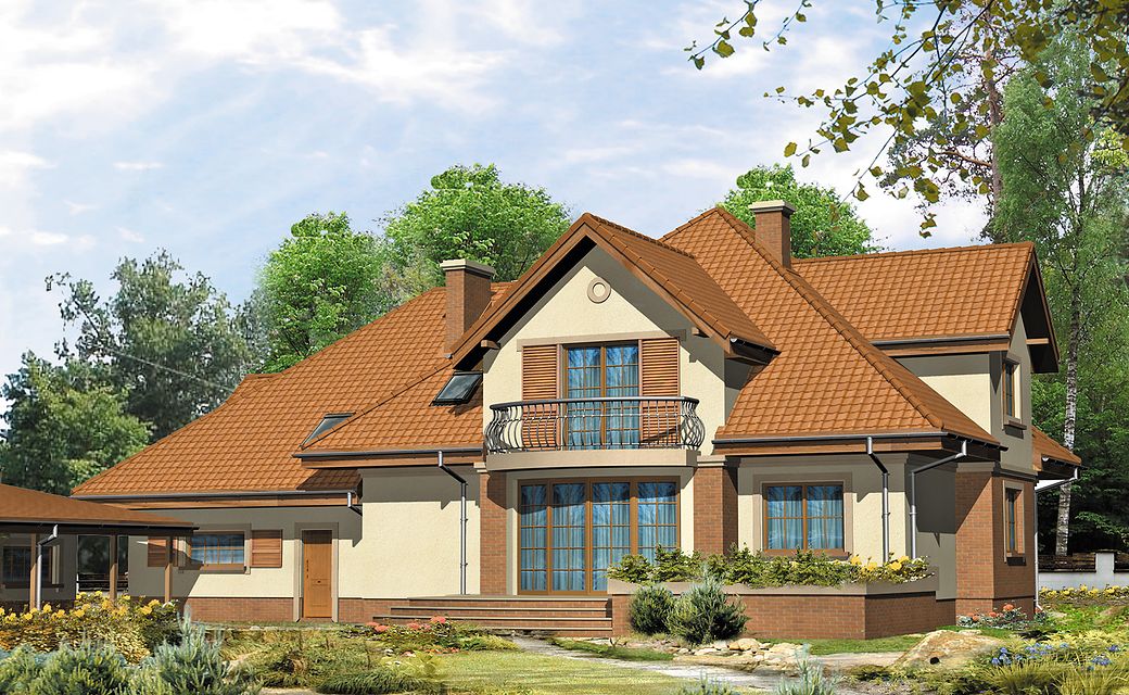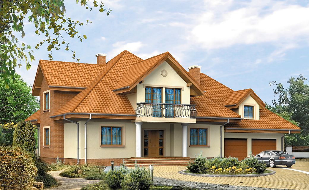 House Bachus 5 was created in imitation of the famous Bachus project. Unlike the original version, the design has more rooms, a larger area, a basement. The Bachus 5 house plan is suitable for a medium-wide plot of land. The house has a simple shape, so its implementation will not require too much financial resources. Glazing provided in the bay will give the interior more spaciousness. It is intended for investors who have a plot of land that allows for the implementation of a free-standing project. The project provides for a double garage in the line of the building. It is also an interesting proposition for people looking for a house with a tent roof that perfectly protects the building against unfavorable weather. The Bachus 5 project is a one-story house with an attic, thanks to which the household members can enjoy greater privacy. The basement included in the project will be appreciated by people for whom functional solutions are of particular importance. The house design is characterized by a spacious living area. A big advantage of the kitchen closed to the living room is the clear division of rooms. Thanks to this solution, the household members can pursue their cooking passion in peace. There is a table in the kitchen that makes it more functional. The architect also provided a place for a dining room, thanks to which shared meals will be an excellent opportunity to talk in a family atmosphere. Additionally, the living room has a fireplace, which gives the interior a unique atmosphere. The eight bedrooms included in the house are the optimal option for a large family. The space can also be used as a guest room or office. The terrace designed by the house is a perfect place to relax. The brick technology recommended by the architect ensures durability and solidity of the structure. Bachus 5 will satisfy investors who appreciate the features of a traditional style, so it will look great regardless of the area.