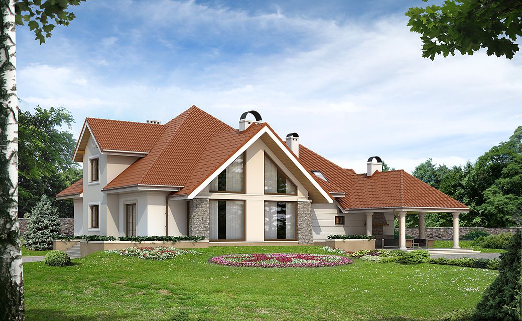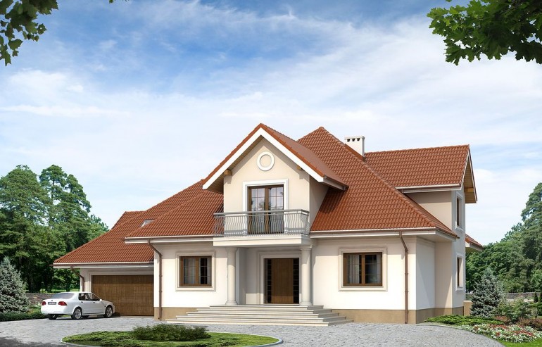 The Artemida house plan is an interesting proposition for people with a plot of medium width. The house has a typical shape, so its implementation will not require too much financial resources. It is intended for investors who have a plot of land that allows for the implementation of a free-standing project. The author of the project envisaged a double garage in the line of the building. It is also an excellent proposition for people looking for a house with a tent roof that perfectly protects the building against unfavorable weather. The Artemida project is a one-story house with an attic, thanks to which the household members can enjoy more privacy. The heart of the house is a spacious day zone, which is conducive to spending time together with your loved ones. It is created, among other things, by a functional kitchen that will fulfill the dream of every hostess. The living area includes a living room and a dining room, making the interior of the house very functional. The fireplace located in the living room not only looks great, but also provides pleasant warmth on cooler days. Five comfortable rooms will meet the needs of a family of 5-7. The space can also be used as a guest room or office. Certainly, every lady of the house will appreciate the advantages of the wardrobe provided for in the design. In addition to this, the house also has a utility room that you can use according to your needs. The mezzanine included in the design gives the interior a unique character. The terrace next to the house is perfect for spending time outdoors. The house was designed in brick technology. Its appearance refers to the traditional style, which is an ideal solution for people who value classics and simplicity.
