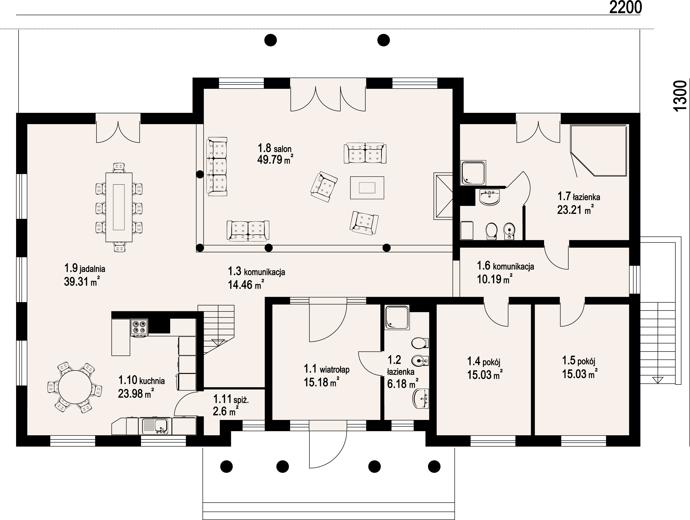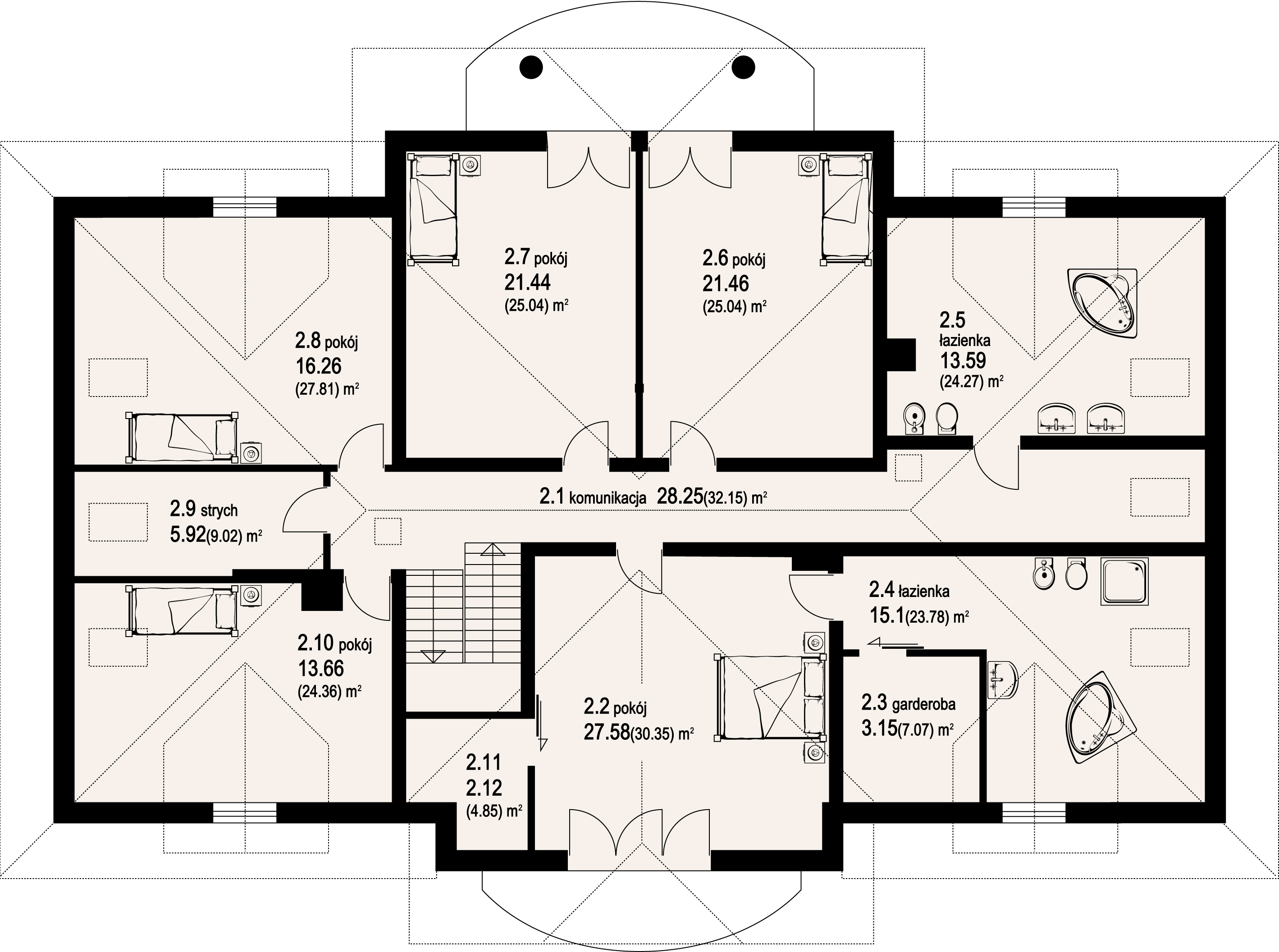 The building Gdów new 9 is a variant of the well-known Gdów new project. Unlike the basic version, the design has more rooms, a larger area, a basement. The house plan, Gdów Nowe 9, is a perfect solution for people with a plot of medium width. The house has a simple shape, which makes it cheap to build. The design has a ridge parallel to the road, which is often specified in the spatial development plan. The project was designed for plots that allow the house to be located in a detached building. It is also an excellent proposition for people looking for a house with an envelope roof, which is characterized by high resistance to adverse weather conditions. The Gdów new 9 project is a one-story house with a usable attic, thanks to which the household members can enjoy more privacy. The building has a basement where a laundry room and a utility room can be arranged. Supporters of spacious spaces will surely be pleased with the living area provided for in the design. It is made up of, among other things, a kitchen, which thanks to its dimensions is fully adjustable and functional. The pantry included in the design will greatly facilitate keeping order. The day zone is also created by a spacious living room and dining room. Additionally, the living room has a fireplace, which gives the interior a unique atmosphere. The seven bedrooms included in the house are the optimal option for a large family. The space can also be used as a guest room or office. The impressive terrace allows you to come into contact with nature without too far away from the privacy of your home. The project was created for investors who plan to build a house in brick technology. the villa.