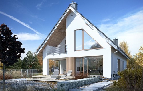 The house design of Available 6 is a perfect combination of a modern look with a fully functional interior. The house has a simple shape, which directly affects the smooth workflow. It is intended for investors who have a plot of land that allows for the implementation of a free-standing project. The building is topped with a gable roof, so its implementation does not take much time. The project belongs to the category of houses with a ridge located parallel to the road, which is often defined in development conditions. The project provides for a single garage in the body of the building, with a passage from the residential part through a practical wardrobe. Available 6 is a one-story house with an attic, which means that the day and night zones are clearly separated from each other. The living area provided for in the design will surely satisfy those who prefer spacious interiors. This zone of the house includes large glazing and an open space above the living room, thanks to which the interior looks modern and very effective. Additionally, the living room has been combined with the dining room - such a solution fits perfectly into the current arrangement trends. The kitchen is open yet slightly separated from the rest of the rooms. Thus, cooking enthusiasts can easily pursue their hobbies, and at the same time freely talk to other household members. People working at home will appreciate the fact that there is a study and a bathroom on the ground floor. An additional room is also a perfect solution if you need to spend the night. There are three spacious bedrooms in the attic. From one of them there is an entrance to an impressive loggia. On this floor there is also a bathroom, a laundry and drying room and a mezzanine - an ideal place to rest with a book. Family gatherings on sunny days will be made more pleasant by the terrace next to the house. The project was made in brick technology, thanks to which the house remains pleasantly cool in hot weather. The Available 6 project is characterized by a minimalist body with large glazing, making it an ideal choice for supporters of a modern style.