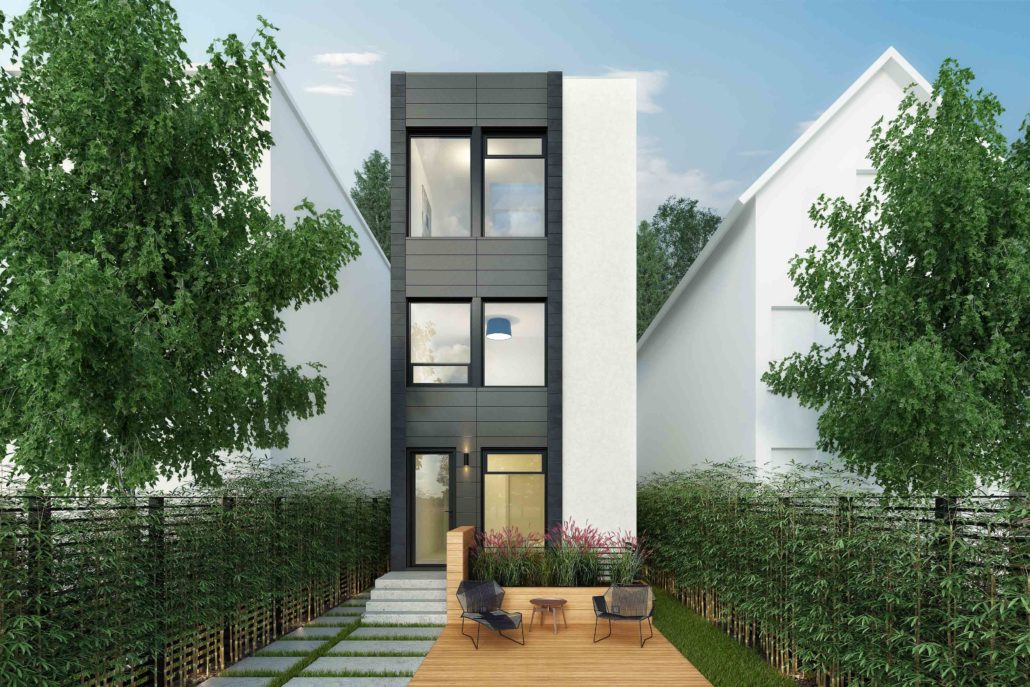 The standout feature of this inspirationis a reversal of the traditional story configuration, with the bedrooms in the basement and ground floor, and the kitchen, dining room and office situated on the top floor. The first floor has a double-height master bedroom with a curtain glass wall looking out onto the street.