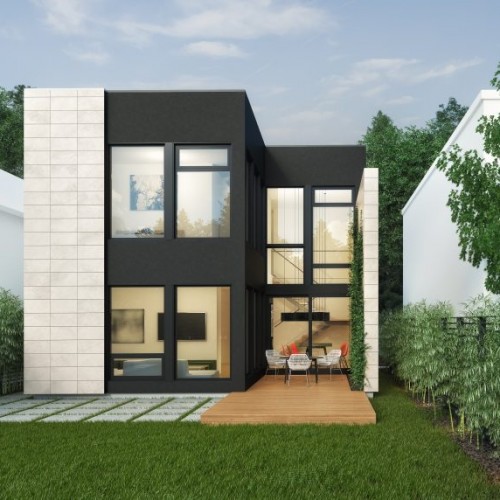 With ample natural light provided by a cutout and double-height glass wall at the rear of the building, the design of this inspiration strikes a perfect balance between creative use of interior space and mood-enhancing light. From an entrance through a mudroom and laundry room, the main floor’s social space is open concept, with a dining room situated on the double height between the staircase and backyard patio, and the living room further back, separated from the kitchen by a fireplace. On the upper floor, the staircase divides the spaces, with the master bedroom at the back of the house and the other two bedrooms at the front. The master bedroom features an open-concept bathroom to catch natural light from the double-height glass wall.