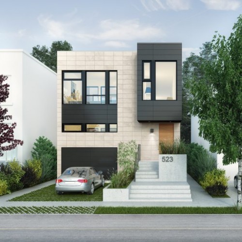 The living room at the front of the building features a fireplace and is cantilevered over the entrance and leads through to the master bedroom with an open bathroom, a walk-in closet and a TV room facing the interior courtyard. The corridor leading to the large master bedroom has a double-height ceiling with natural light from a full glass wall that looks through to the interior courtyard. The first floor kitchen and dining room are separated from the living room by the interior courtyard and staircase, while a backyard patio is covered for privacy with a JNCN pergola that extends the kitchen area to form an urban garden. The home also features two bedrooms, a shared bathroom, and a laundry/utility room, with a mudroom shared between the garage entrance and the main entrance.