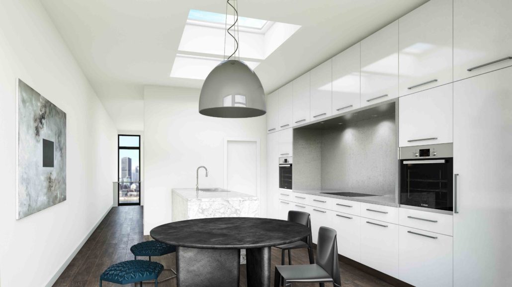The standout feature of this inspirationis a reversal of the traditional story configuration, with the bedrooms in the basement and ground floor, and the kitchen, dining room and office situated on the top floor. The first floor has a double-height master bedroom with a curtain glass wall looking out onto the street.