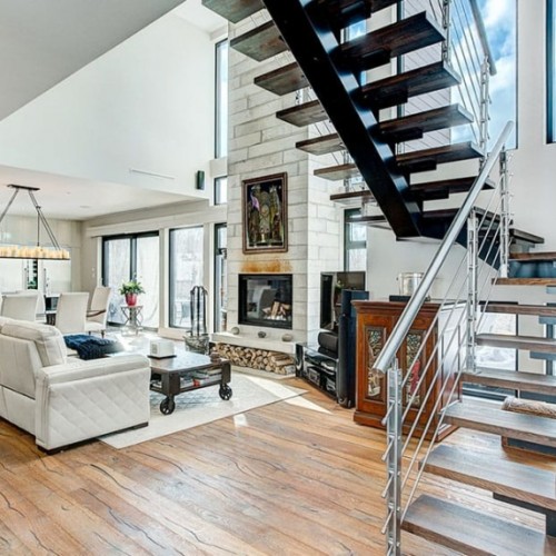 A couple nearing retirement chose this JNCN HOMES home as a place deep in the countryside where they could work and relax in equal measures. Located in a valley and surrounded by fields and forest, the home is built on a slope, with oversized windows covering most of the rear facade. The two-story home has high ceilings and a large, open-plan kitchen that leads through to a spacious living room and dining room on the first floor. Upstairs, there are two offices and a master bedroom, plus gym, and everywhere you turn on both floors there are amazing views of the surrounding land from the massive windows.