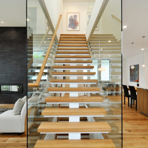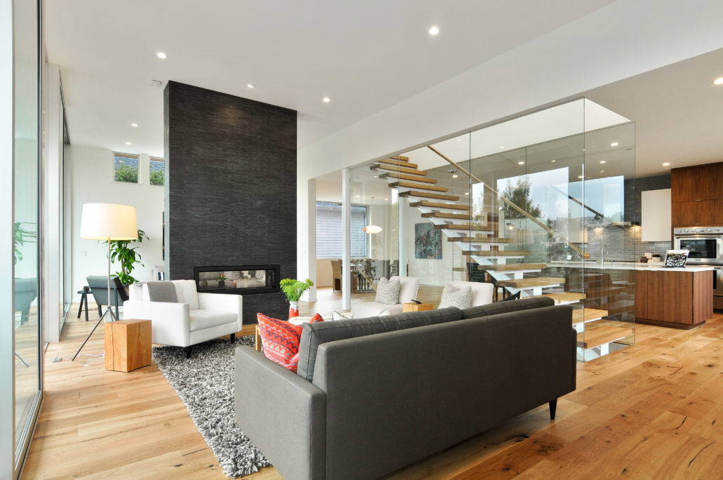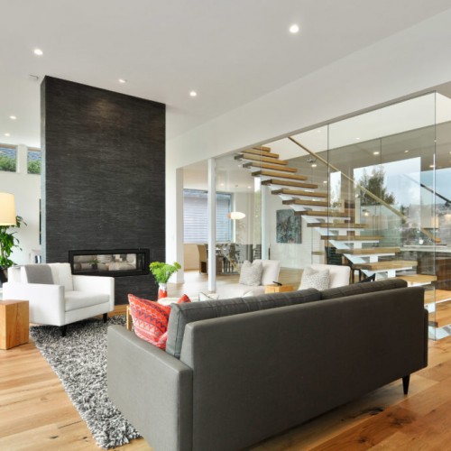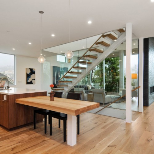 Main level has an expansive open floor plan with lovely views. The glass-enclosed stair and see-through fireplace, coupled with 12 foot high sliding doors and 40 foot wide deck, make this a perfect home for entertaining while remaining private and sheltered among the trees.