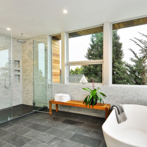 Four and a half baths with custom walnut vanities.