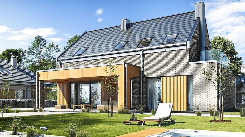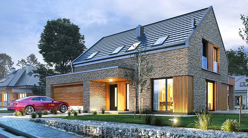 The Rumba house plan is a new version of the project belonging to the group from the series of houses derived from the "Party" project, which together form a collection of "dancing" houses, that is: Party, Party 2, Biba, Fokstrot, Salsa, Samba, Tango. The design of the Rumba house was designed on a functional plan similar to the aforementioned houses, but its style is completely different, original. The entire body of the building is finished with one material - all walls are covered with clinker tiles. Window openings widened with additional cladding made of wood create cutouts in this uniform brick block. A gable roof made of flat tiles, without eaves, completes the composition. The design of the Rumba house is modern, original and will surely stand out from dozens of similar houses - roofers. At the same time, the finishing materials used bring to mind: elegance, decent workmanship, durability and longevity of the building. This effect was achieved despite the relatively low cost of building the house. The Rumba house plan has a very simple shape and structure - it will be easy and relatively cheap to build. The interior of the house: on the ground floor there is an open living space of the combined living room, hall and kitchen. A kitchen with an island, a wall fully built-in household appliances, with a front window reaching the floor will decorate the living space. The living room with a wide fireplace and TV wall opens onto the surrounding garden and partially covered terrace with large glazing. The other rooms on the ground floor are a room (office or an additional bedroom), a bathroom with a shower and a storage compartment under the landing of the stairs, a pantry between the kitchen and the vestibule, and a double garage and a boiler room. In the attic, we have three bedrooms, including: parents' apartment with a bathroom, dressing room and own terrace, and two children's bedrooms with built-in wardrobes, separate bathroom and laundry room. In a small area of the house, it was possible to design a very comfortable interior for a family of 4-6 people. The Rumba house design is an excellent proposition for brave investors who want to stand out in a smart way. A consistently implemented project will be an attraction among the surrounding buildings and certainly no one will pass by such a gem indifferently. Welcome!