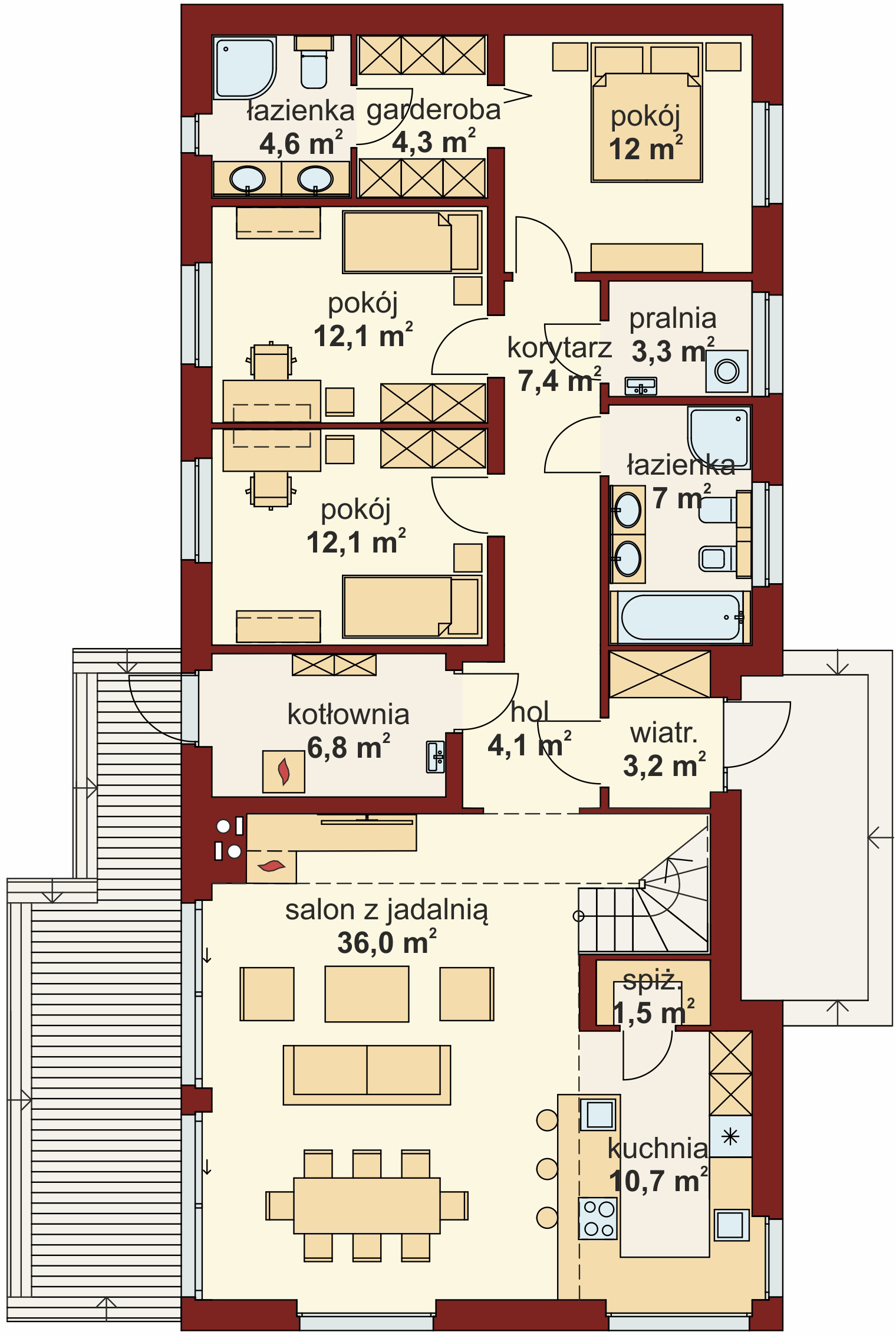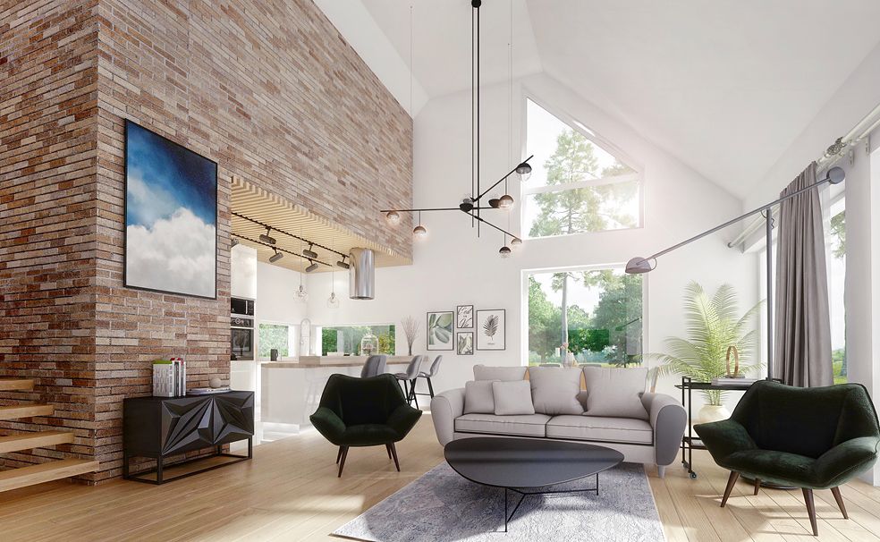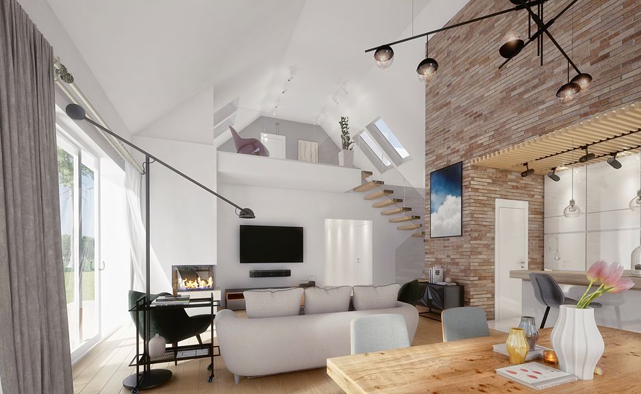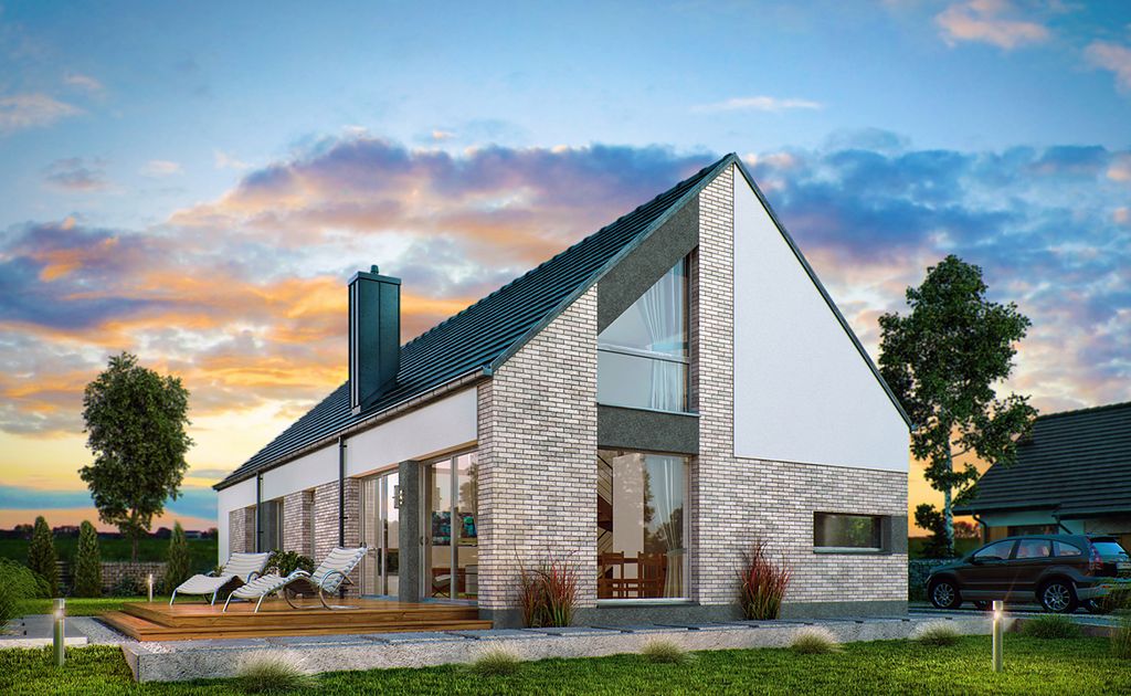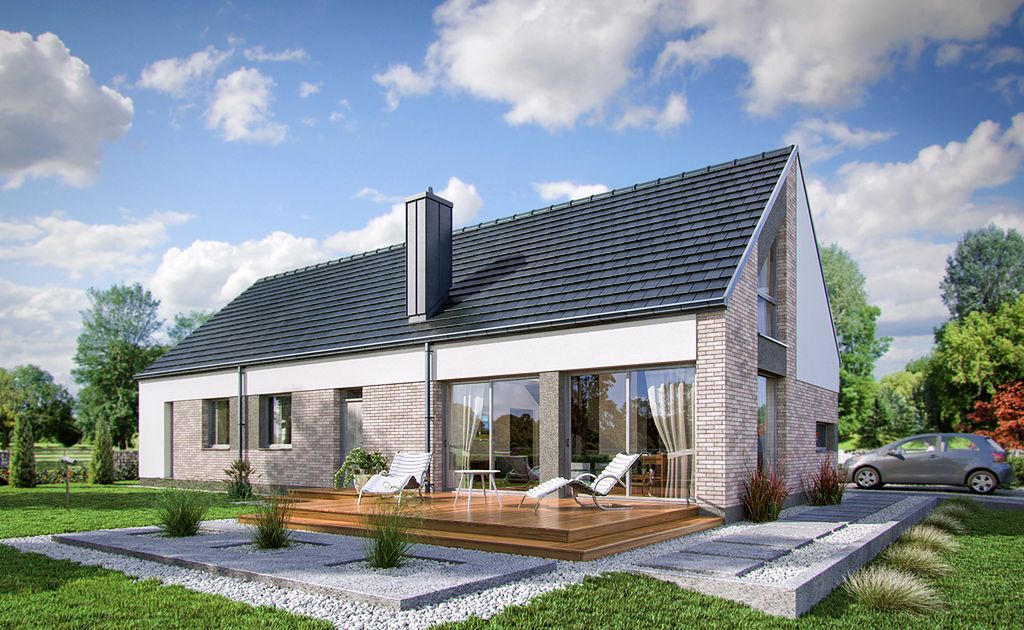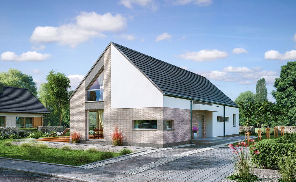 DOMENY 123 is a project for a family of 4-5 people, created for a narrow plot. The vestibule with space for a wardrobe opens onto the day zone, consisting of a spacious living room with a dining area and an easy to separate kitchen with a pantry. From the corridor, we have access to two rooms, a bathroom, a laundry room and a master bedroom with a wardrobe and another bathroom adjacent to it. The stairs lead to the mezzanine from which there is access to the attic. A large unused attic can be easily adapted for utility purposes, for example as additional rooms. The standard design has an additional fireplace heating design with a water jacket. Visualization is a proposal of how a given house design and its surroundings can be arranged. The method of running the terrace, the shape of the walls and elements of small architecture such as pergolas, pots, etc. are not included in the scope of the project. Therefore, in the construction design, these elements may not be included in the design (see pergolas) or their shape and method of running (size of terraces, wall profile) may be changed.