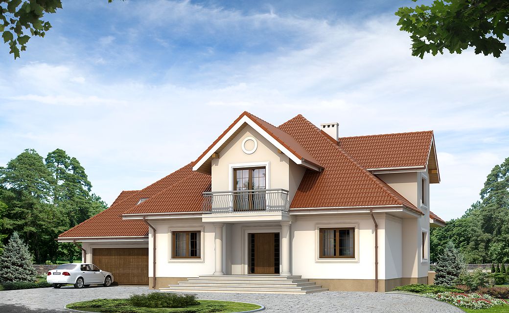 The Artemida house plan is an interesting proposition for people with a plot of medium width. The house has a typical shape, so its implementation will not require too much financial resources. It is intended for investors who have a plot of land that allows for the implementation of a free-standing project. The author of the project envisaged a double garage in the line of the building. It is also an excellent proposition for people looking for a house with a tent roof that perfectly protects the building against unfavorable weather. The Artemida project is a one-story house with an attic, thanks to which the household members can enjoy more privacy. The heart of the house is a spacious day zone, which is conducive to spending time together with your loved ones. It is created, among other things, by a functional kitchen that will fulfill the dream of every hostess. The living area includes a living room and a dining room, making the interior of the house very functional. The fireplace located in the living room not only looks great, but also provides pleasant warmth on cooler days. Five comfortable rooms will meet the needs of a family of 5-7. The space can also be used as a guest room or office. Certainly, every lady of the house will appreciate the advantages of the wardrobe provided for in the design. In addition to this, the house also has a utility room that you can use according to your needs. The mezzanine included in the design gives the interior a unique character. The terrace next to the house is perfect for spending time outdoors. The house was designed in brick technology. Its appearance refers to the traditional style, which is an ideal solution for people who value classics and simplicity.