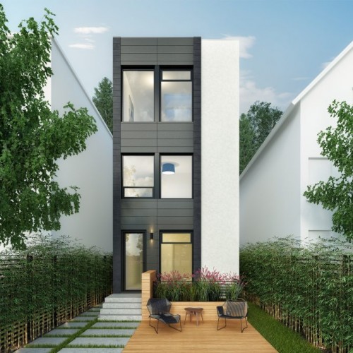 The standout feature of this inspirationis a reversal of the traditional story configuration, with the bedrooms in the basement and ground floor, and the kitchen, dining room and office situated on the top floor. The first floor has a double-height master bedroom with a curtain glass wall looking out onto the street.