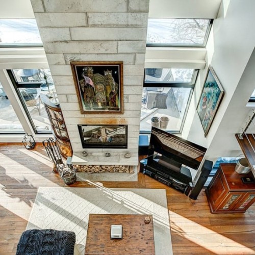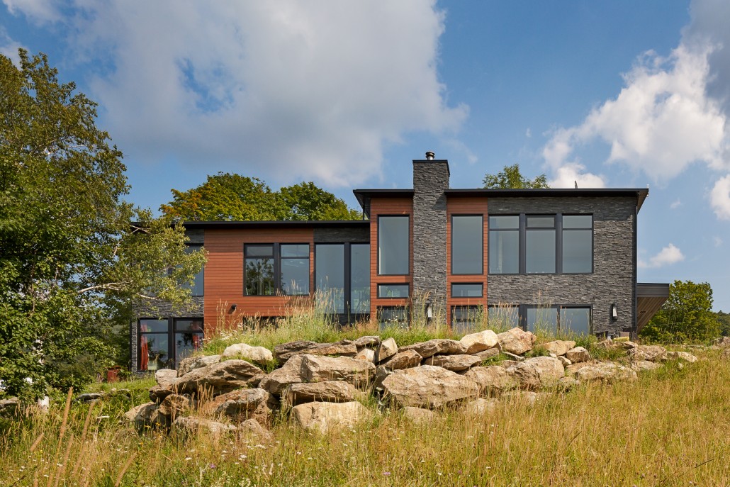 A couple nearing retirement chose this JNCN HOMES home as a place deep in the countryside where they could work and relax in equal measures. Located in a valley and surrounded by fields and forest, the home is built on a slope, with oversized windows covering most of the rear facade. The two-story home has high ceilings and a large, open-plan kitchen that leads through to a spacious living room and dining room on the first floor. Upstairs, there are two offices and a master bedroom, plus gym, and everywhere you turn on both floors there are amazing views of the surrounding land from the massive windows.